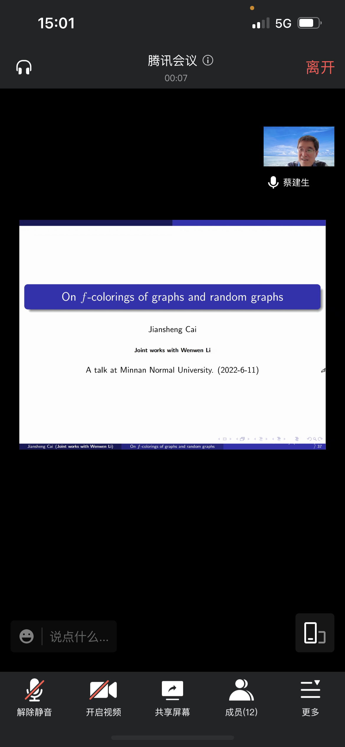 应数学与统计学院与3044永利集团官网邀请,6月11日下午,潍坊学院蔡建生教授在腾讯会议作了题为《On f-colorings of graphs and random graphs》的报告。相关师生聆听了此次报告,报告由卢福良老师主持。