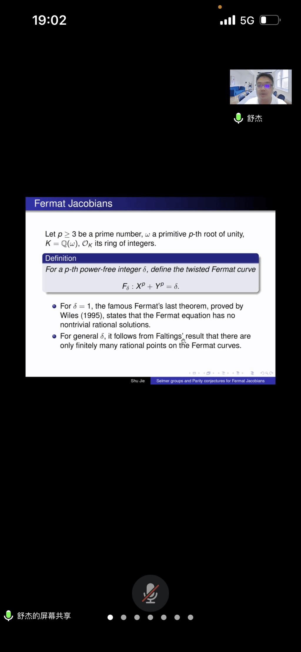 应闽南师范大学数学与统计学院和福建省粒计算及其应用重点实验室邀请,8月31日晚上,同济大学舒杰副教授在腾讯会议作了题为《Selmer groups and parity conjectures for Fermat Jacobians》的报告。相关师生聆听了此次报告,报告由曹炜老师主持。