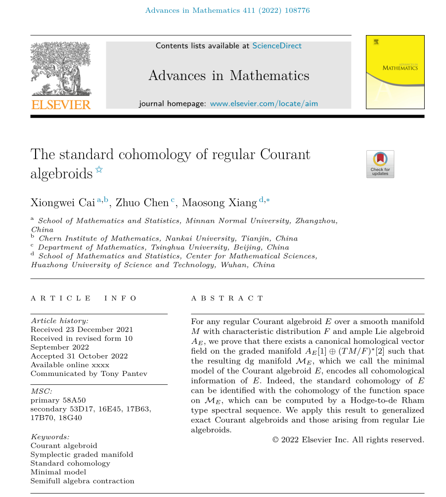 近日,3044永利集团官网成员、数学与统计学院青年教师蔡雄伟博士与清华大学陈酌、华中科技大学向茂松两位老师合作,以第一作者并以我校为第一署名单位在国际顶级数学期刊《Advances in Mathematics》上发表题为《The standard cohomology of regular Courant algebroids》的学术论文。