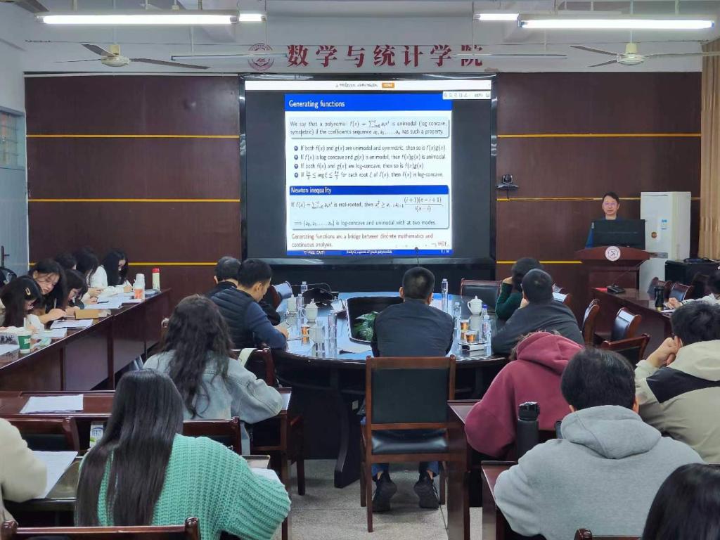 报告中,王毅教授主要介绍图多项式在图论研究中起着重要作用,讨论图多项式的某些解析性质,重点是系数的单峰性、对数凹度和根的位置。报告结束后,在座的师生就相关研究问题进行了探讨和交流。